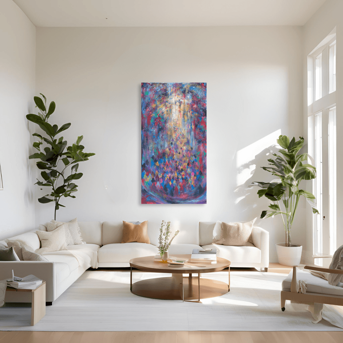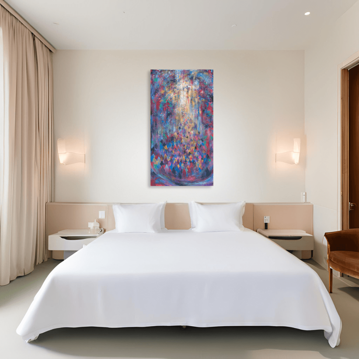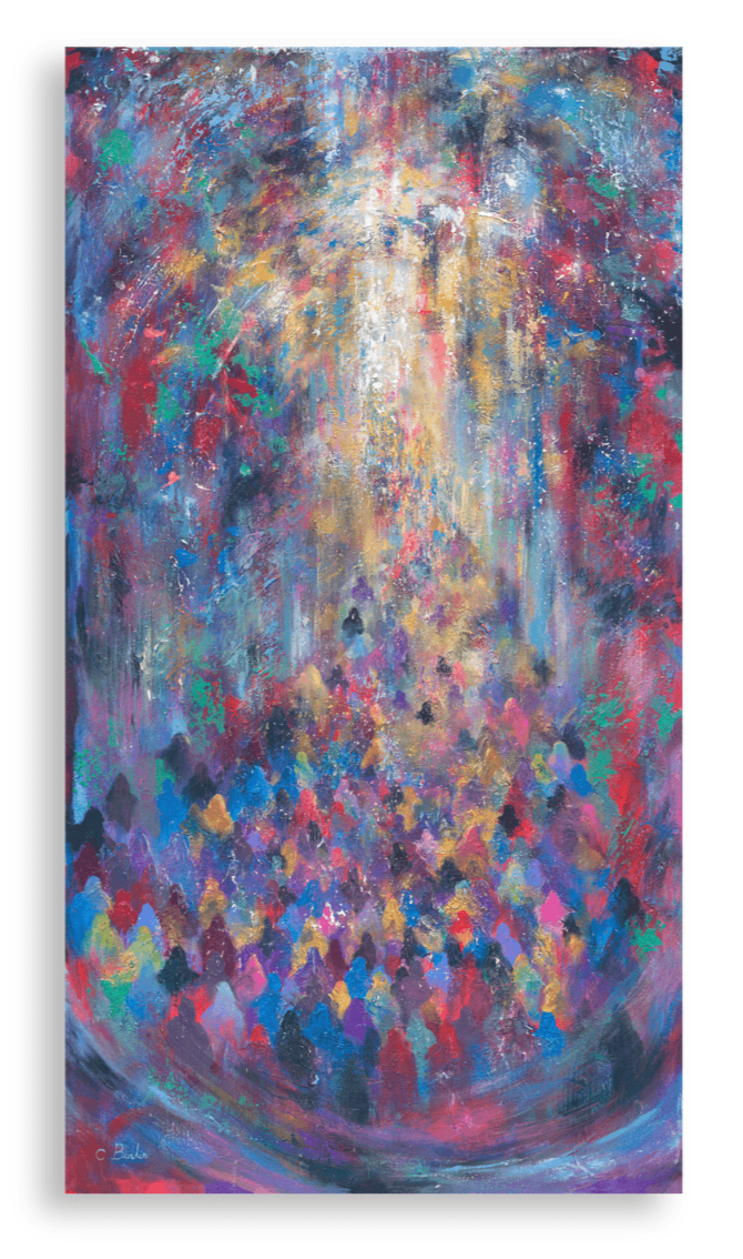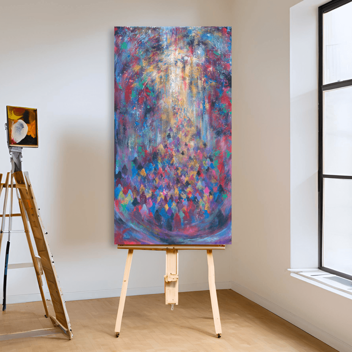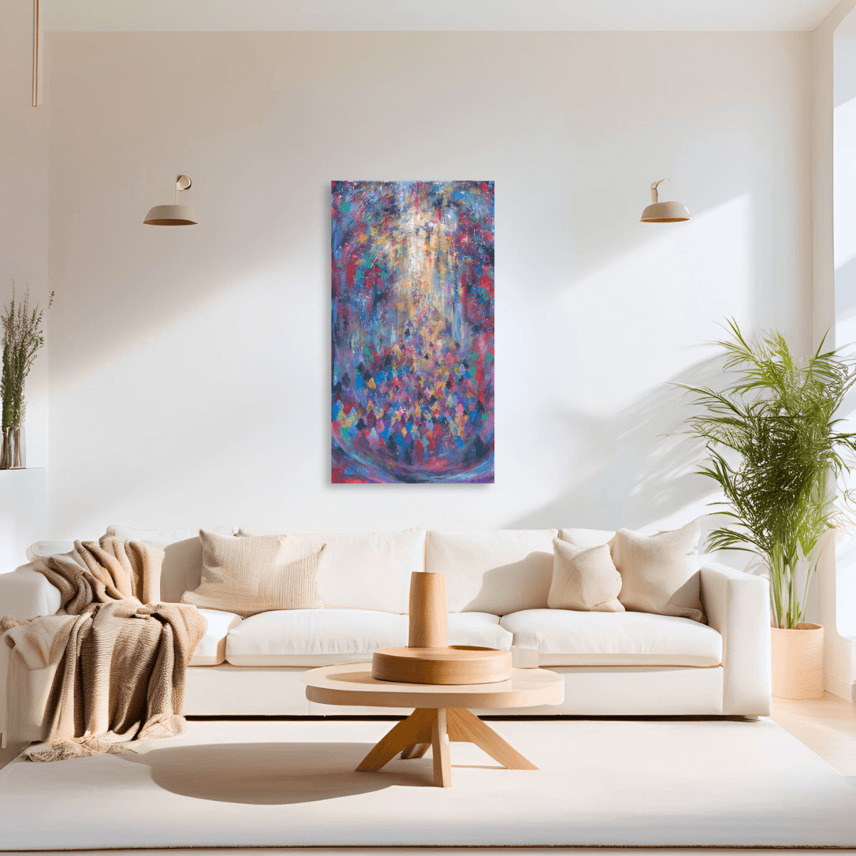 In this stunning work, the artist combines vibrant colors and numerous figures reminiscent of the story of the Red Sea splitting. The concentrated colors in the foreground resemble a crowd gathering and moving toward the light, symbolizing the miracle and the new path that opened before them. The blend of colors and composition conveys a sense of movement and of holiness, allowing the viewer to feel this historical moment in a vivid and emotional way.